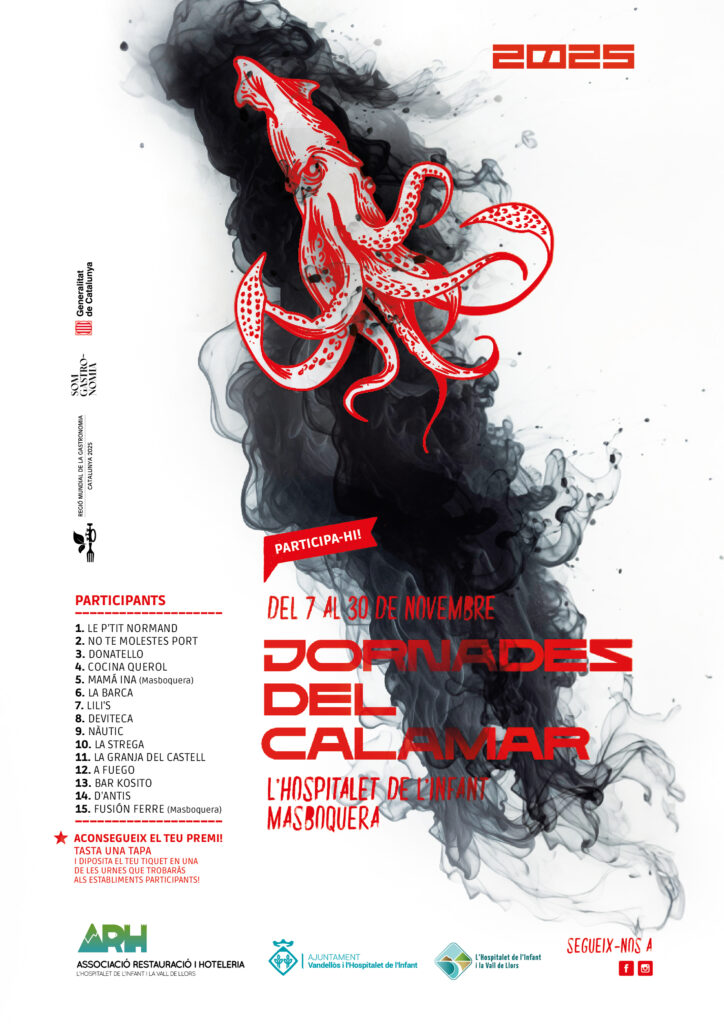 L’Associació de Restauració i Hoteleria de l’Hospitalet de l’Infant i la Vall de Llors ha organitzat per primera vegada les Jornades del Calamar, amb la col·laboració de la Regidoria de Turisme de l’Ajuntament de Vandellòs i l’Hospitalet de l’Infant. Aquesta nova proposta gastronòmica, que tindrà lloc del 7 al 30 de novembre, comptarà amb la participació de quinze establiments del municipi —tretze de l’Hospitalet de l’Infant i dos de Masboquera—, que oferiran una àmplia varietat de tapes, racions i plats elaborats amb calamar.