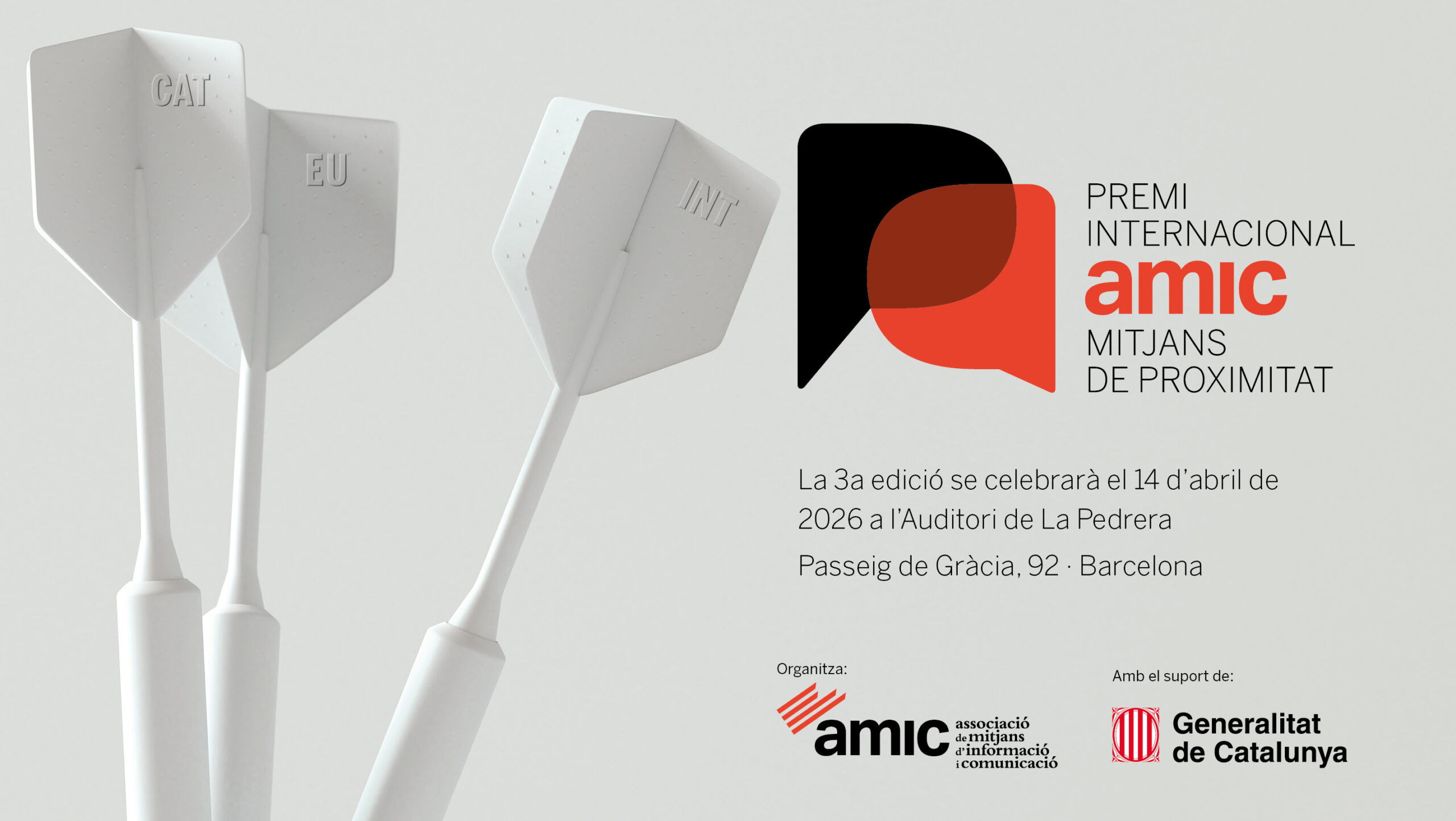 L’Associació de Mitjans d’Informació i Comunicació celebrarà la tercera edició del Premi Internacional AMIC de Mitjans de Proximitat el pròxim 14 d’abril a l’auditori de La Pedrera (Passeig de Gràcia, 92, Barcelona) a les 18 h.