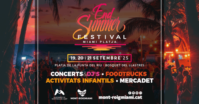 L’End Summer Festival torna aquest setembre a Miami Platja per celebrar una nova edició, la quarta. Seran tres jornades plenes de música, gastronomia, activitats infantils, mercat d’artesania i moltes sorpreses més per acomiadar com cal l’estiu. L’esdeveniment, organitzat per Mont-roig Miami Turisme, tindrà lloc del divendres 19 al diumenge 21 desetembre a la Platja de la Punta del Riu i Bosquet del Llastres.