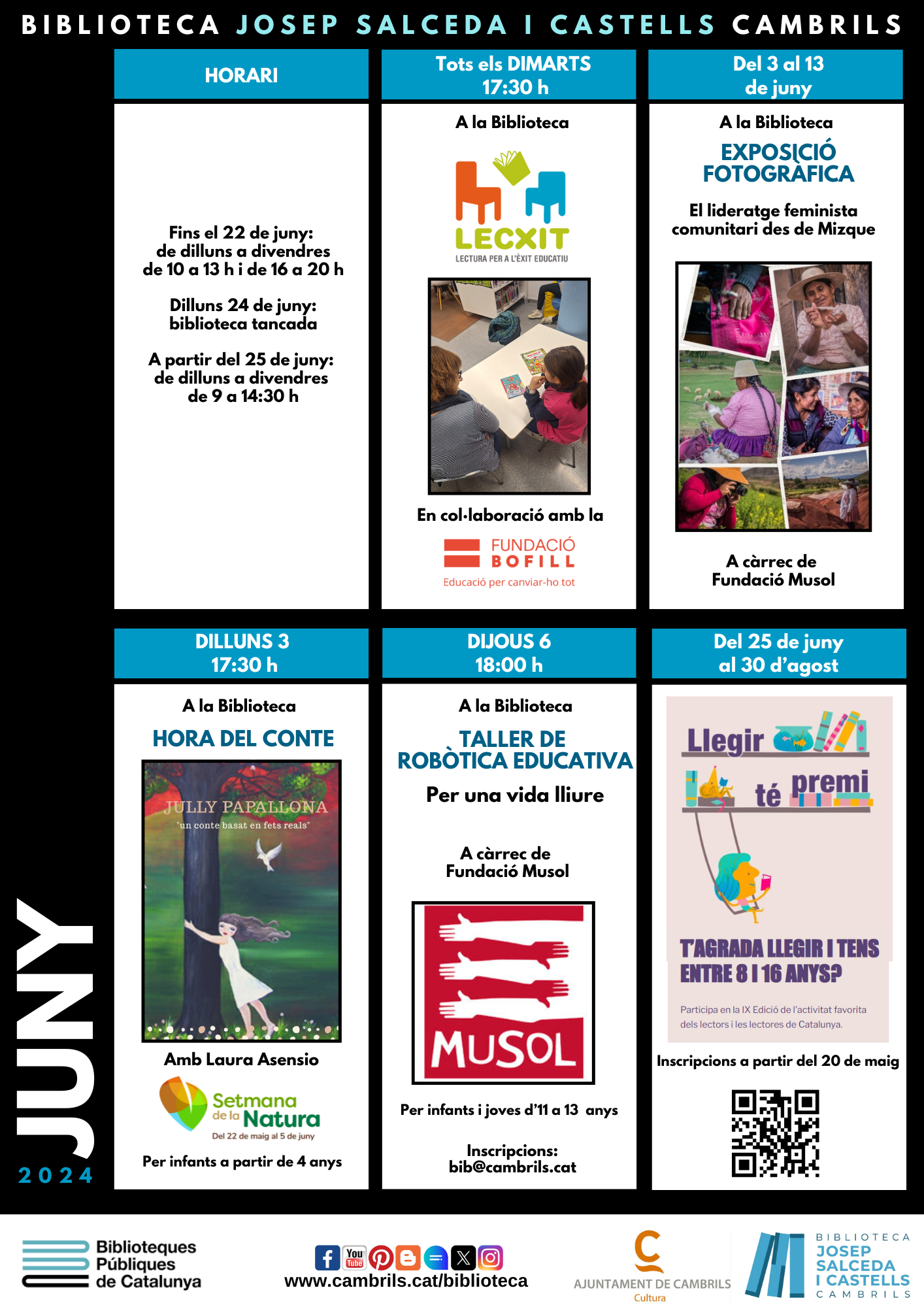 Fins el 22 de juny, la biblioteca obrirà en el seu horari habitual de dilluns a divendres de 10 a 13h i de 16 a 20h. El dilluns 24 l’equipament estarà tancat per la festivitat de Sant Joan i a partir del 25 de juny l’horari serà de 9 a 14:30 hores.