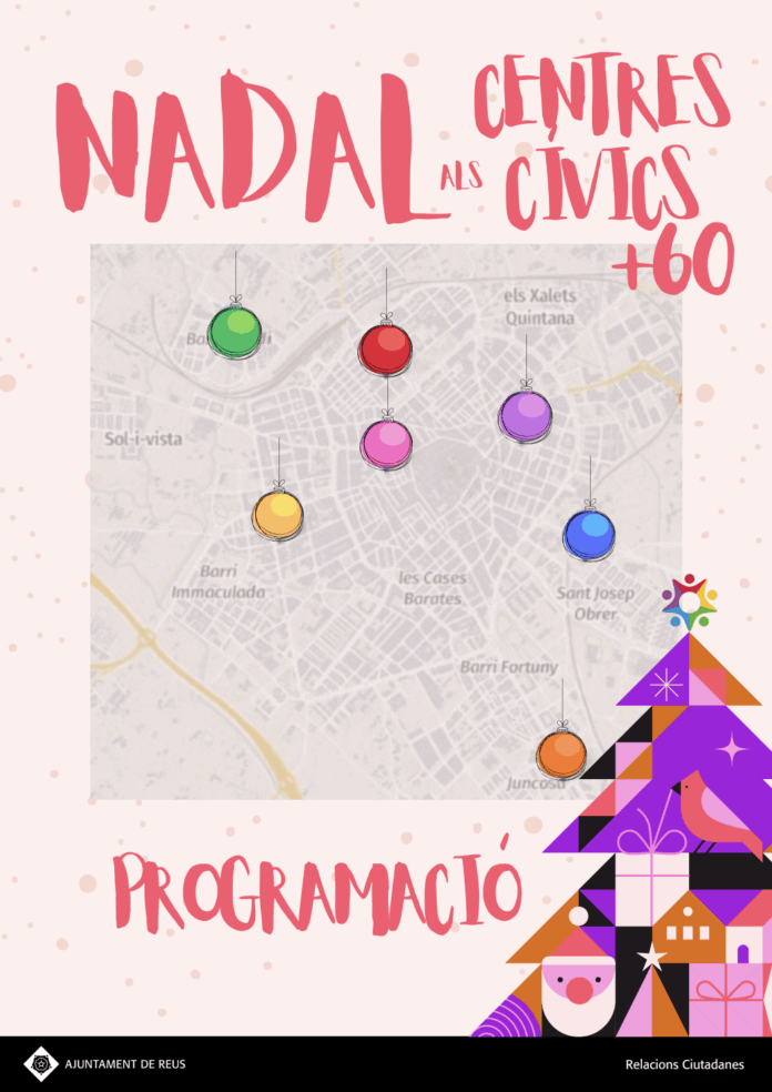 L’Ajuntament de Reus, a través de la Regidoria de Relacions Ciutadanes i amb la col·laboració dels centres cívics, dels casals municipals de la gent gran, de les entitats i de la Federació d’Associacions de Veïns de Reus, ha preparat una completa programació d’activitats de Nadal adreçada a tots els públics.