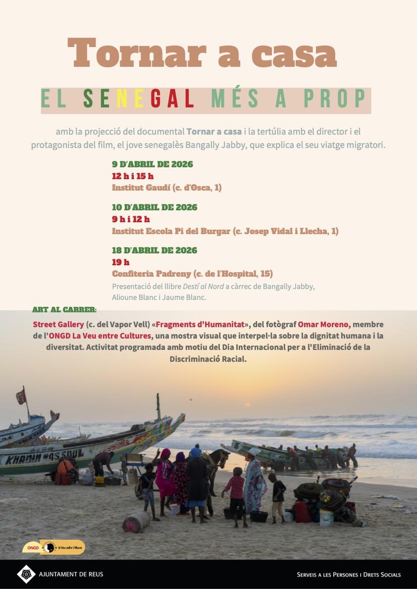 El dijous 9 d’abril, un centenar d’alumnes de l’Institut Gaudí participaran en dues sessions del taller «Tornar a casa», a les 12 h i a les 15 h, que combinen la projecció del documental Tornar a casa amb una tertúlia posterior. L’activitat compta amb la participació del director, Jaume Blanc, i del protagonista del documenta l, el jove senegalès Bangally Jabby, que comparteix en primera persona la seva experiència migratòria. L’endemà, divendres, al matí es faran dues noves sessions a l’Institut Escola Pi del Burgar. Es tracta d’oferir una visió humana sobre la migració i de fomentar el pensament crític als centres educatius.