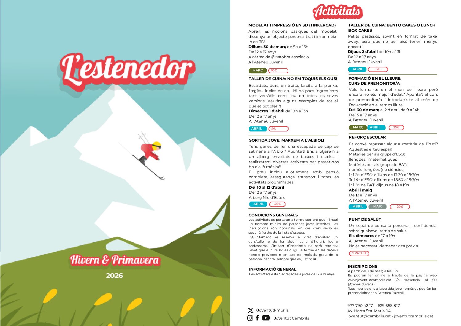 El Departament de Joventut de l’Ajuntament de  Cambrils ha presentat una nova edició d’hivern-primavera del programa d’activitats per a joves L’Estenedor, que ha augmentat notablement l’oferta de places, amb dues esquiades, una sortida jove i diverses activitats de Setmana Santa.