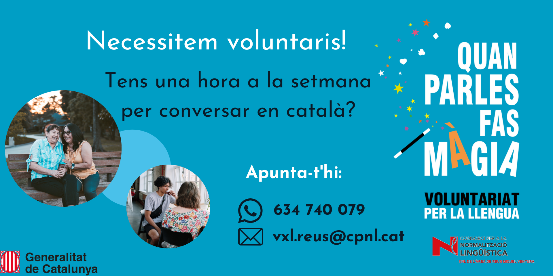 El Centre de Normalització Lingüística (CNL) de l’Àrea de Reus Miquel Ventura fa una crida per trobar abans de divendres quinze persones que per primer cop vulguin participar com a voluntàries en el programa Voluntariat per la llengua (VxL) a Reus.