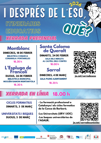 Molts alumnes, quan arriba l’hora de fer les preinscripcions, es troben davant la gran pregunta: “I ara, què faig?”. Per donar resposta a aquesta inquietud, des de l’Oficina Jove de la Conca de Barberà, ja fa molts anys que s’ofereix un cicle de xerrades d’orientació educativa “I després de l’ESO, què?”.
