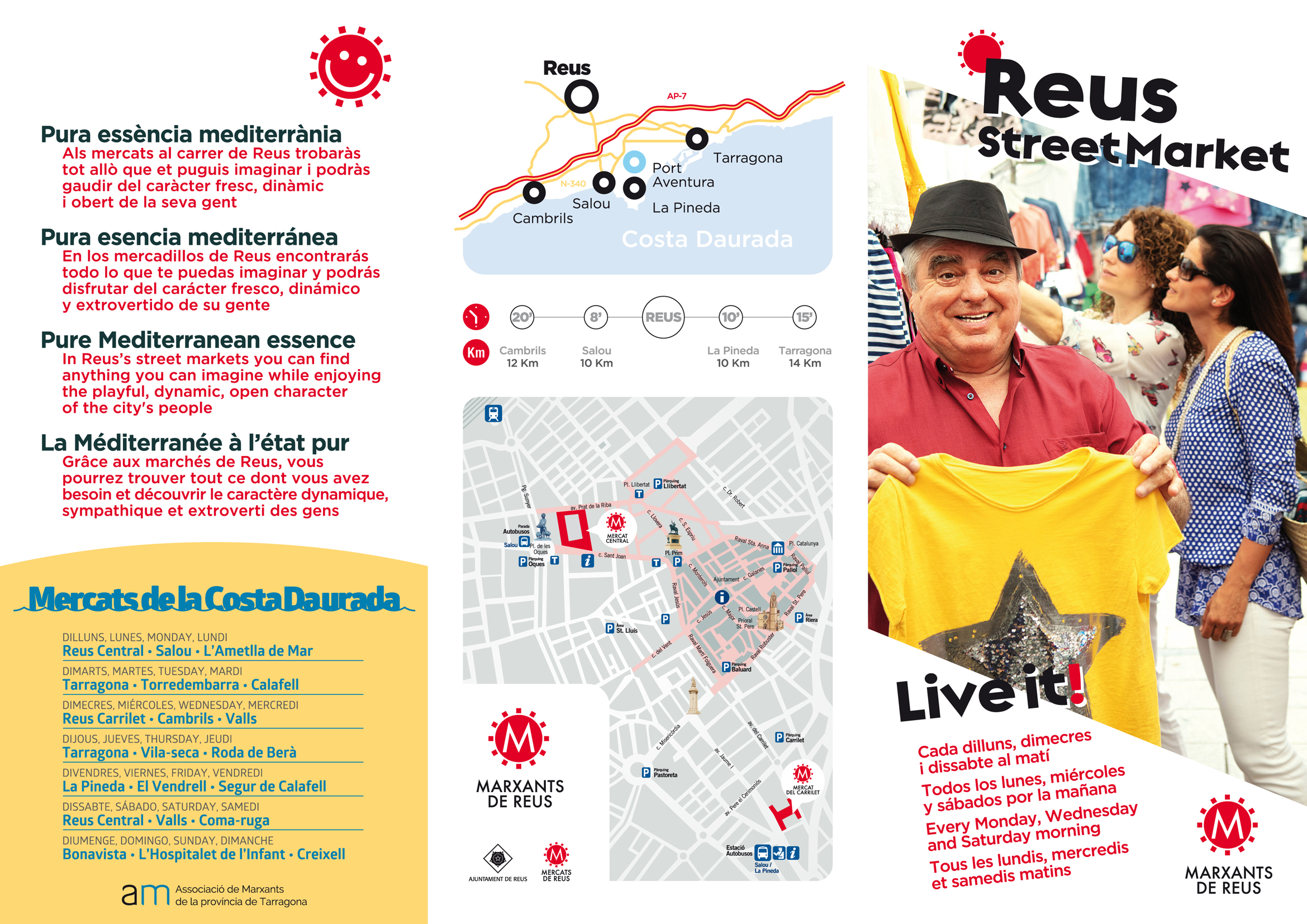 La campanya és visible en diverses cartelleres publicitàries de la ciutat. Els dies dels mercats ambulants es promocionen en un fulletó informatiu, escrit en quatre idiomes: català, castellà, anglès i francès. El tríptic es repartirà pels establiments hotelers i oficines de turisme de la Costada Daurada fins a mitjans de setembre. Concretament, se n’han editat 30.000 exemplars que es poden trobar en més de 200 expositors situats en oficines d’atenció turística, hotels i càmpings de Reus i el Baix Camp, el Baix Penedès, el Tarragonès, l’Alt Camp i la Conca de Barberà.