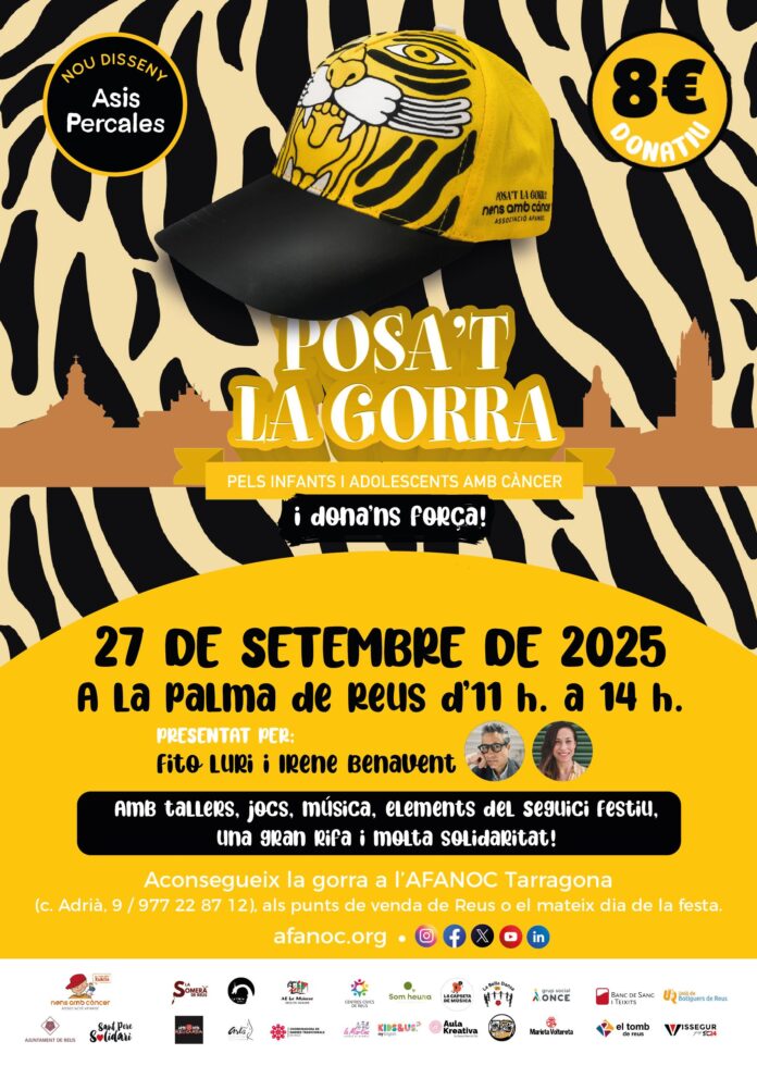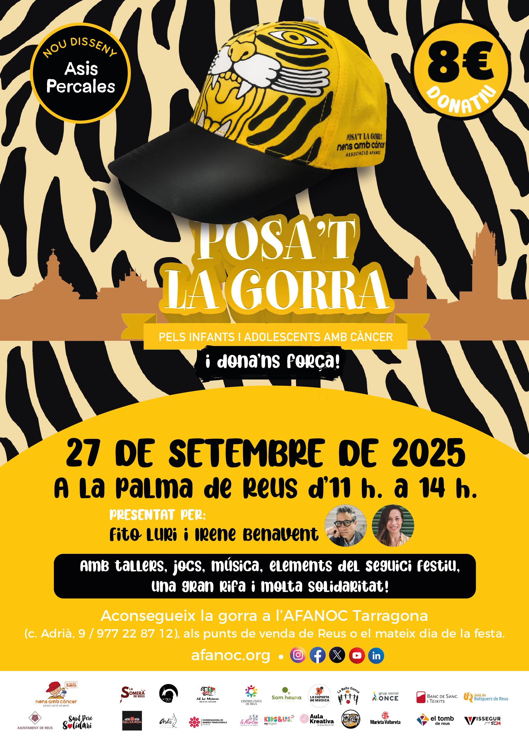 L’Ajuntament de Reus, junt amb altres entitats de la ciutat, col·labora amb la festa solidària «Posa’t la Gorra!», organitzada conjuntament per l’Associació de Familiars i Amics de Nens Oncològics de Catalunya (AFANOC) i l’Associació reusenca «Sant Pere Solidari», el dissabte 27 de setembre d’11 a 14 h a La Palma de Reus, en el marc de les Festes de la Mare de Déu de Mis ericòrdia. L’objectiu és llançar un missatge positiu a la societat sobre la realitat de les famílies amb un infant o adolescent amb càncer. A més, des d’un entorn lúdic i alegre es vol sensibilitzar i transmetre que aquests infants i adolescents són com els altres i que, amb l’acompanyament i el suport necessari, les famílies poden fer front a aquesta situació difícil. L’AFANOC és membre del Consell Municipal de la Discapacitat, que depèn de l’Àrea de Serveis a les Persones i Drets Socials de l’Ajuntament de Reus.