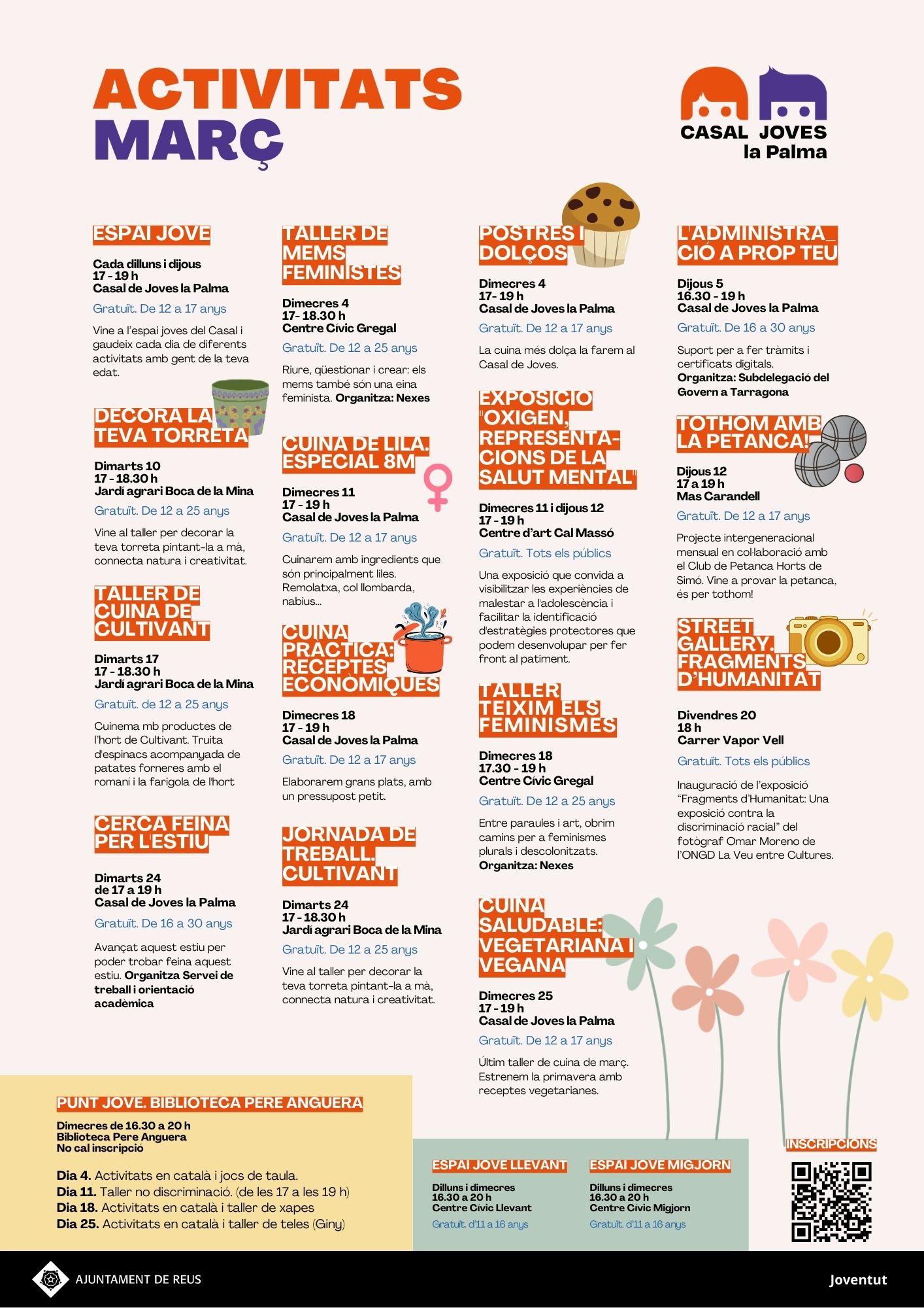 El 10 de març, el projecte Cultivant Reus proposa un taller per decorar torretes a mà, combinant natura i creativitat. En el marc del 8M, el Casal de Joves organitza el taller “Cuina de lila”, on tots els plats es prepararan amb aliments d’aquest color, com la remolatxa o la col llombarda. Altres activitats del mes inclouen una sessió de petanca intergeneracional amb el Club d’Horts d’en Simó; el taller “Teixim els feminismes”, també a proposta de NEXES, i diverses activitats de cuina pràctica i saludable per a joves, els dimecres a la tarda a l’aula setmanal de cuina.