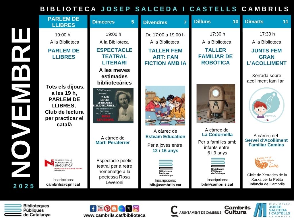 En l’apartat de tallers, aquest novembre la biblioteca ofereix el taller artístic “Fan Ficrion amb IA d’Esteam Education per a joves d’entre 12 i 16 anys (7 de novembre) i un taller familiar de robòtica a càrrec de La Codornella per a famílies amb infants entre 6 i 9 anys (10 de novembre). Les persones interessades es poden inscriure al correu bib@cambrils.cat.