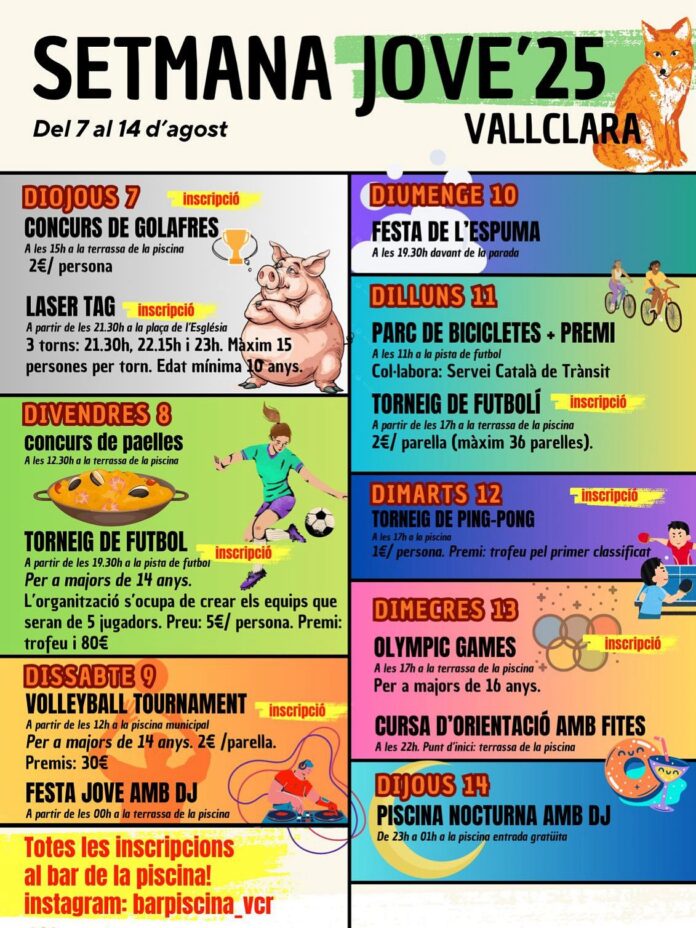La Setmana Jove de Vallclara és organitzada pels joves de Vallclara, el bar de la piscina l’Ajuntament de Vallclara i la col·laboració de l’Oficina Jove de la Conca de Barberà.