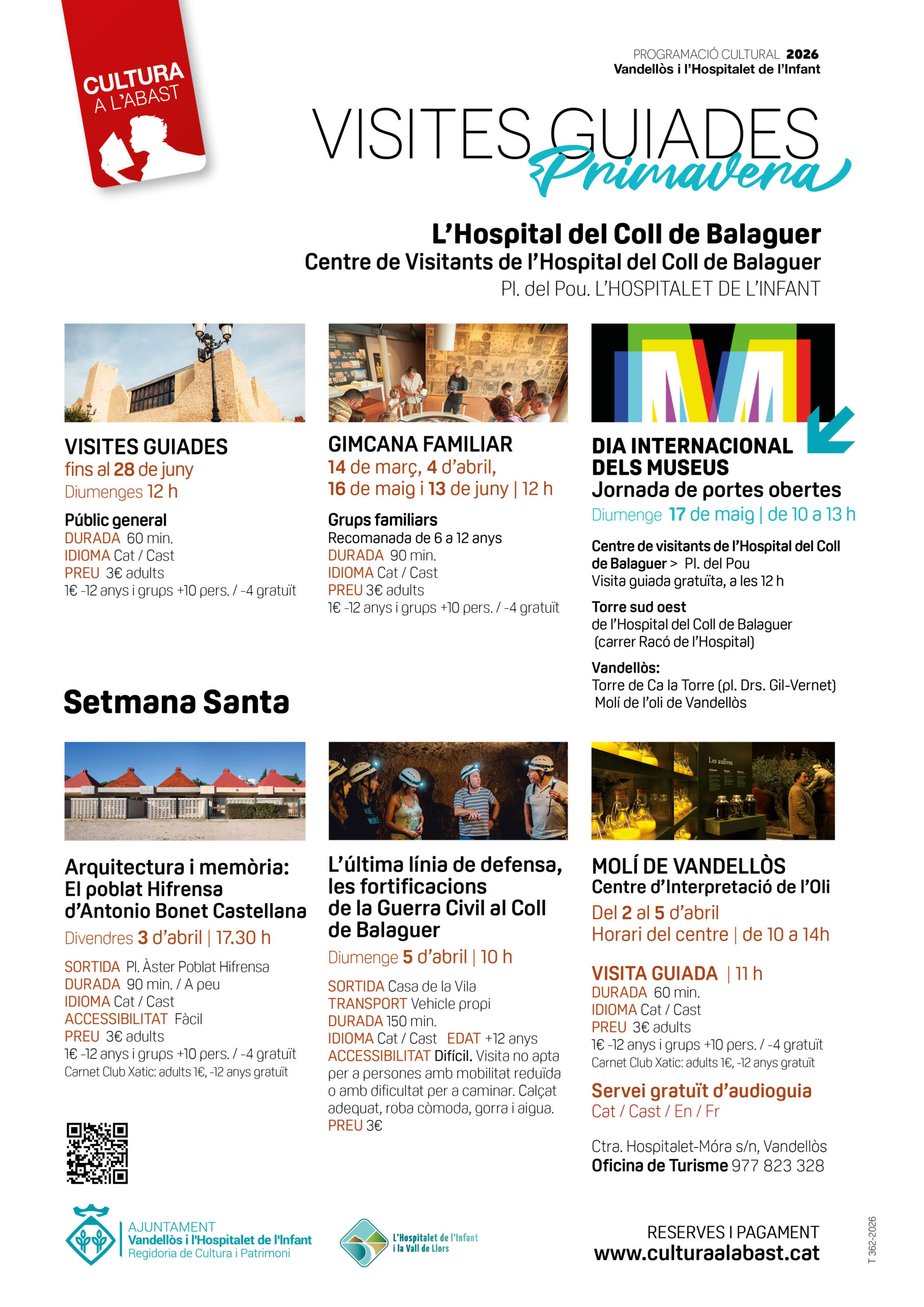 Una de les propostes destacades és la visita guiada al Centre de Visitants de l’Hospital del Coll de Balaguer, que es farà els diumenges a les 12 h fins al 28 de juny. Aquesta visita permet conèixer la història de l’antic hospital fortalesa fundat per l’infant Pere d’Aragó l’any 1344 per defensar i assegurar el pas pel Coll de Balaguer. A l’espai museogràfic situat dins dels murs del monument s’hi expliquen les característiques i la història d’aquest conjunt patrimonial, origen del poble de l’Hospitalet de l’Infant.